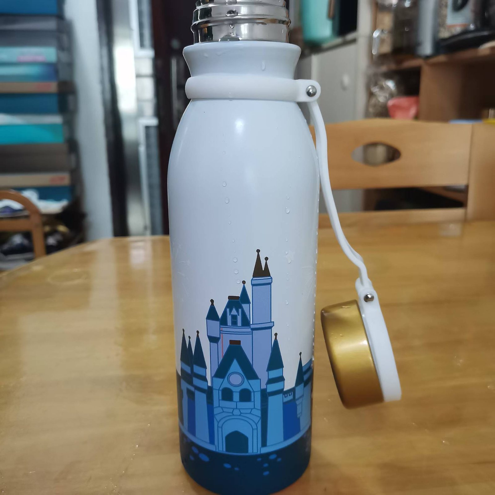 What really sets this water bottle apart is its color-changing feature.when filled with ice water into the bottle, it transforms from a solid color to a vibrant, swirling design featuring the cinderella castle ,fireworks and your self picture on it. if its color is blue, and you pour hot water into it, the bottle color will change into white.